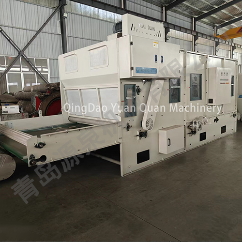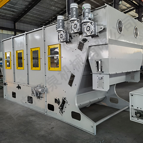 將經(jīng)過(guò)粗開(kāi)松混合后的纖維經(jīng)輸棉風(fēng)機(jī)送入送料管道進(jìn)入本機(jī)上棉箱,經(jīng)上給棉羅拉送至開(kāi)松輥進(jìn)一步開(kāi)松后落入下棉箱,這一過(guò)程再次混合原料,經(jīng)由振動(dòng)篩,振實(shí)后形成筳棉層進(jìn)入下道工序。