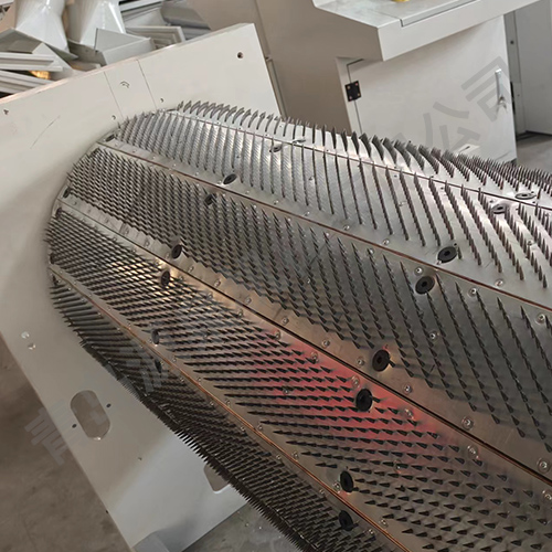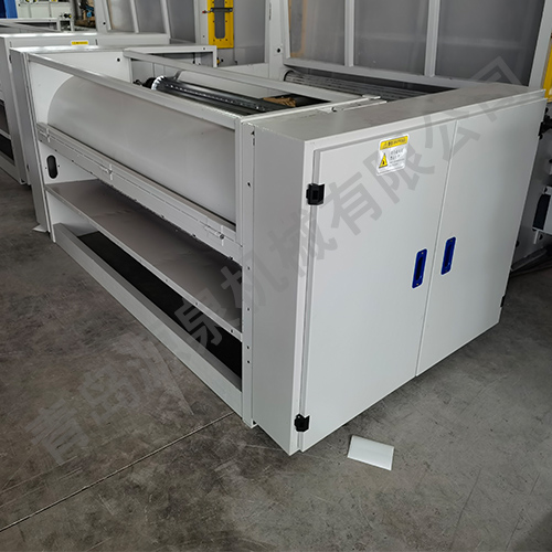 把纖維、原料經(jīng)喂入平簾輸送至喂入羅拉,再由開松輥高速開松后,經(jīng)輸棉風機以適量的風量輸送纖維原料供后遞工作使用。經(jīng)本機開松后的纖維、原料效果好,均勻、細致。
